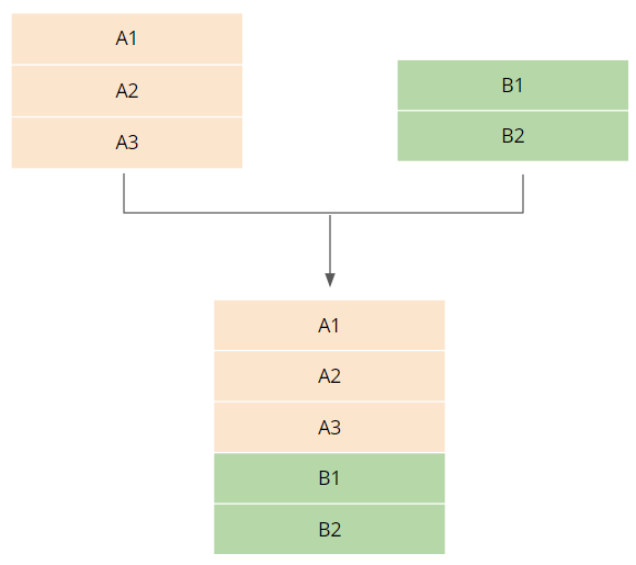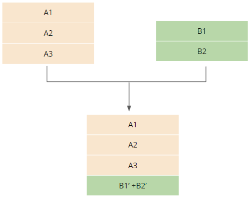 Duplicate Prims: The B input is merged intact and the A input is flattened using duplicate prims (the ‘ indicates a duplicate).