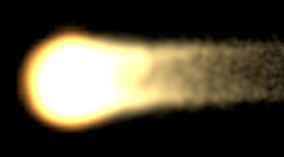 Creates an adjustable comet effect. Double-click the particle system to open its Properties panel and then click the S icon to display the contents of the group. The image shows the 3D particle system rendered through a ScanlineRender node. |