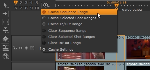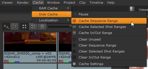 • Select the required sequence in the Sequence tab and then select Cache > Disk Cache > Cache Sequence Range from the menu bar.