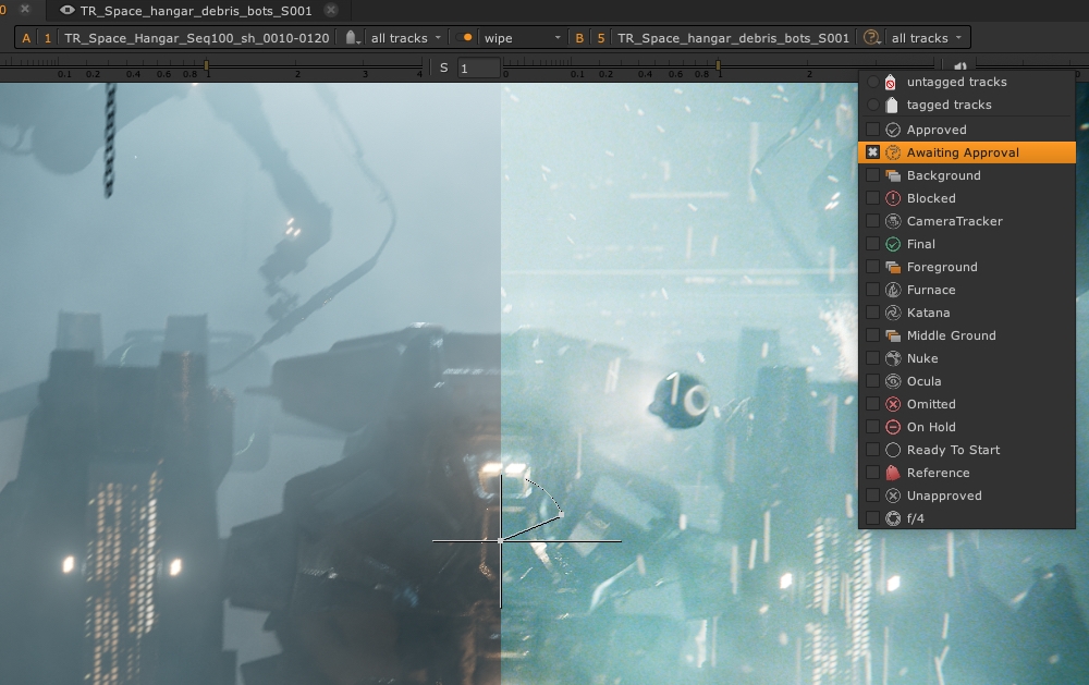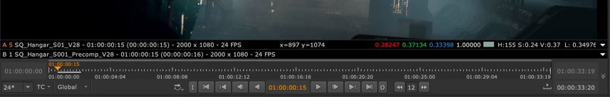 The Viewer A/B tools allow you to quickly compare media using the two Viewer input buffers. Select a clip, sequence, shot or track and press A or B to place your selection in the Viewer input buffers. You can also drag-and-drop items into the input buffers using the Viewer hotspots.