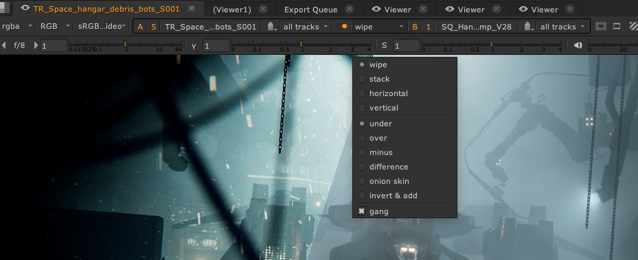 The wipe and stack modes also allow you to blend the two buffers together, and in the case of wipe mode, provides a handle in the Viewer to quickly wipe between the two inputs.