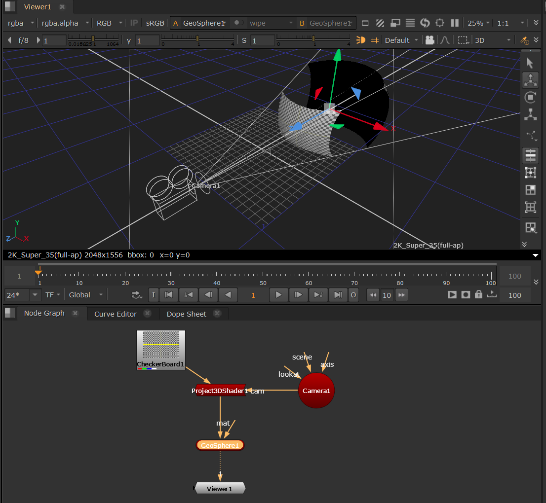 Select 3D > 3D > Shader > Project3DShader to insert a Project3DShader node downstream of the image you want to project (for example a CheckerBoard). |
