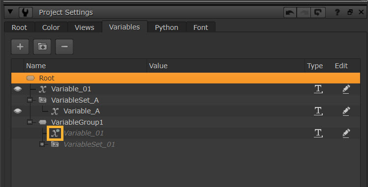 When a VariableGroup node is first added to the script you’ll notice that Variables from its parent(s) are automatically inherited and displayed in the tree view. These are denoted by an inherited Variable icon (green) and italicised/dimmed Name and Value.