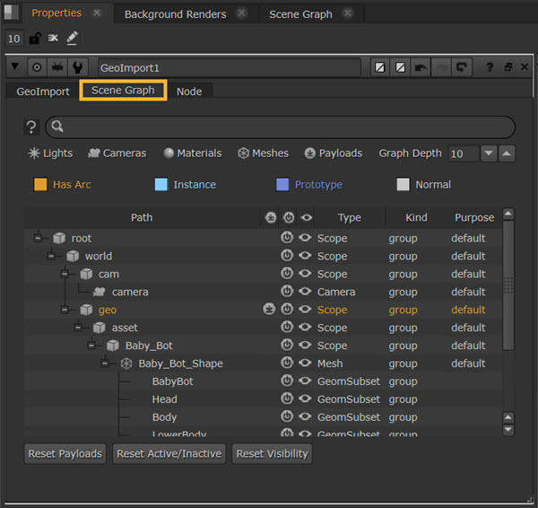 | 8. | If you wish to amend the payloads, activation, and visibility after the initial import, you can do so by accessing the Scene Graph tab inside the GeoImport node. |