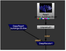 | 1. | Connect your deep source to the depth input of the DeepRecolor node, and your 2D image to the color input. You might want to add an unpremultiply node between your color input and the DeepRecolor if your 2D image is premultiplied. |