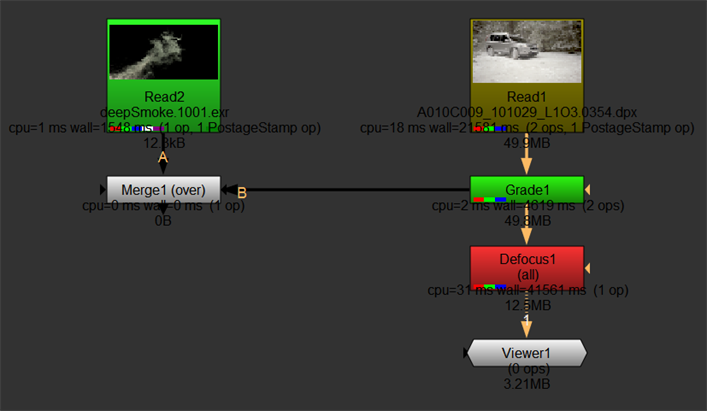 In addition to the timing information, nodes are color-coded according to their profiling, green through red, where red is a slow node. You can see from the example script that Defocus is a slow node, whereas Merge is doing no work at all.