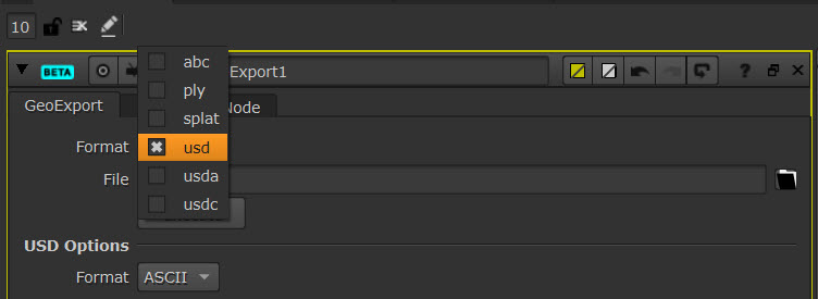 | 2. | In the GeoExport node Properties, select a Format for your export files from Alembic (.abc), USD (.usd, .usda, .usdc), or Splats (.ply or .splat). If you select usd, you’ll also get further USD Options below where you can select from ASCII or Crate. |