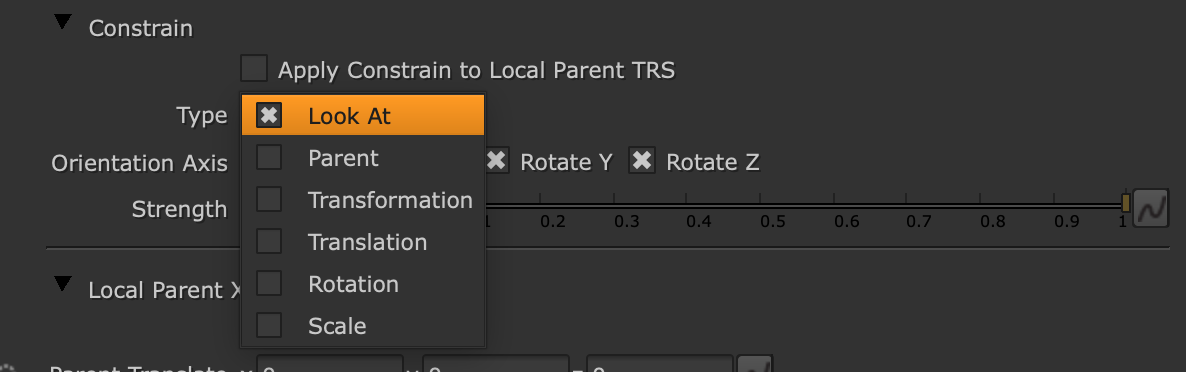 Quickly swap between constraint types — LookAt, Parent, Transformation, Translation, Rotation, and Scale — directly from Axis nodes with the new Constrain input pipe. Combine Axis nodes into the 3D system with the GeoScene node.