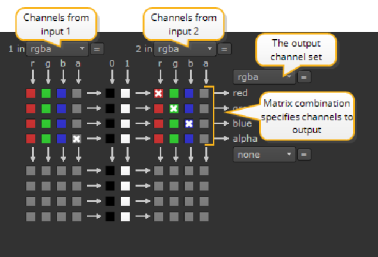 • Channels from Input 1 - the first group of channel boxes are the channels supplied by input 1 on the node. As shown above, the foreground element’s default rgba set is selected.