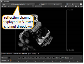 | 7. | To view additional channels, press A to display the alpha channel, and then select the lightingpasses.reflection channel from the Viewer channel dropdown menu. |