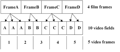 3:2 pulldown is a process of converting 24 frames per second (fps) film to 29.97 fps interlaced video. In this process, the film is first slowed down 0.1% to match the speed difference between 29.97 fps and 30 fps. Then, film frames are distributed across video fields in a repeating 3:2 pattern in order to make 24 film frames fill the space of 30 video frames per second: