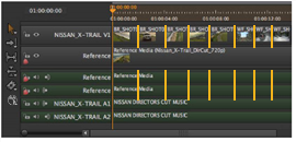 The Copy Cuts function allows you to quickly apply cuts from one track to other tracks on the timeline. For example, in the timeline shown, you could copy the cuts from the second video track to the Reference audio tracks.