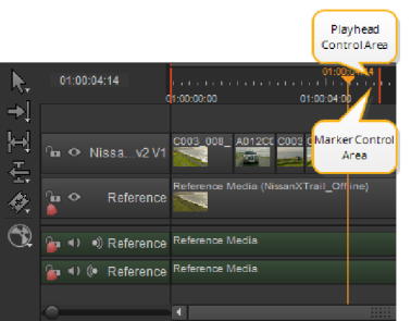 When the playhead is positioned near In and Out markers, the top half of the timecode scale controls the playhead and bottom half controls the markers.