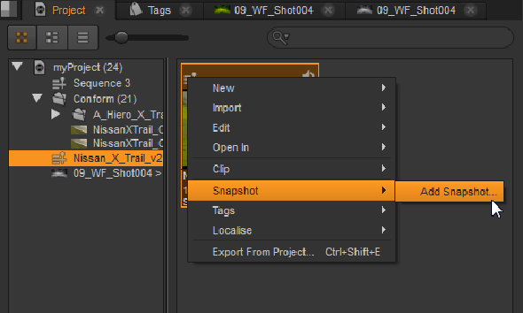 | 2. | Right-click the sequence and select Snapshot > Add Snapshot. |
