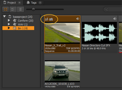 Snapshots are indicated in the bin view with a camera icon containing the number of snapshots available.