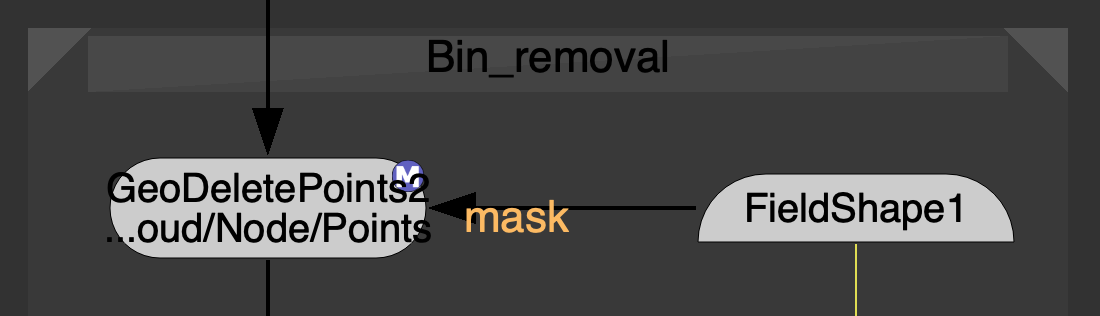 | 3. | This can then be done a second time, using another FieldShape to create a mask for another GeoDeletePoints node. This time the FieldShape targets the specific object to remove in the mask - in this case, the bin in the scene. |