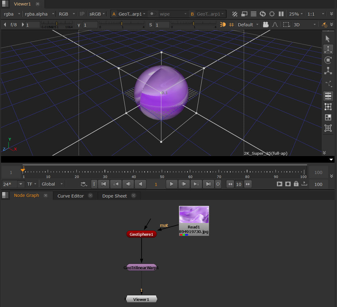 The GeoTrilinearWarp node warps meshes by moving the corners of its bounding box separately to create the warp.