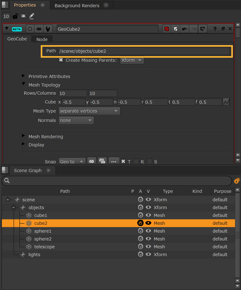 Path and Mask knobs on certain 3D nodes can be used to place items in the Scene Graph hierarchy. Path knobs are located on creation nodes like GeoCube, allowing you to specify the desired position in the scene's hierarchy.