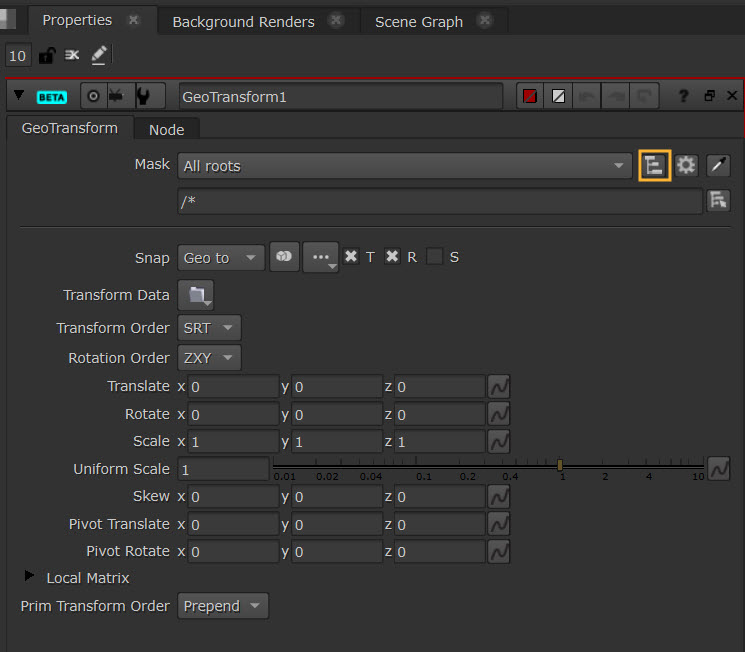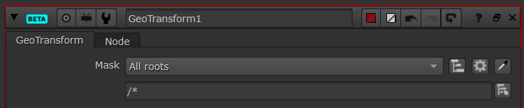 Modifier nodes such as GeoTransform have a Mask knob, to define the prims in the scene that you want the node to affect.