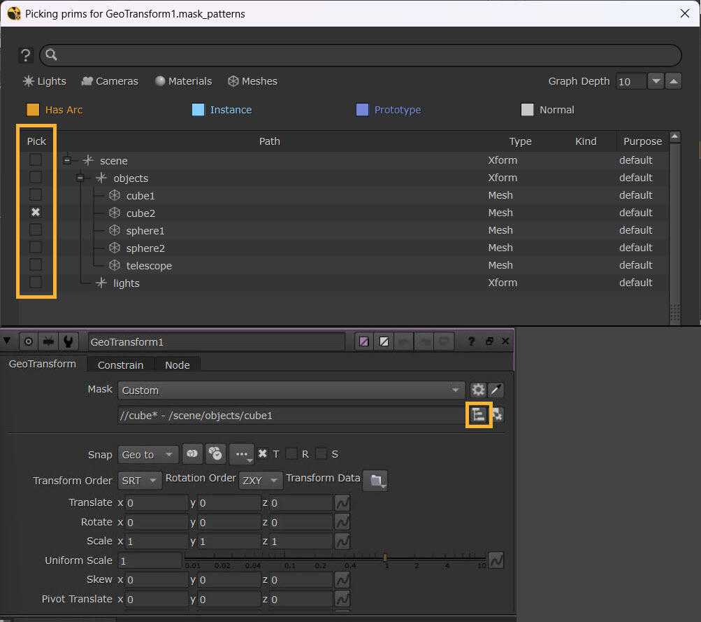 The Mask knob is a dropdown with the most common mask actions displayed, such as All Cameras and All Lights, to make it easier to select the most appropriate mask for your needs. The default is All roots or All meshes, depending on the node, which selects the top most level Xforms in your scene graph.