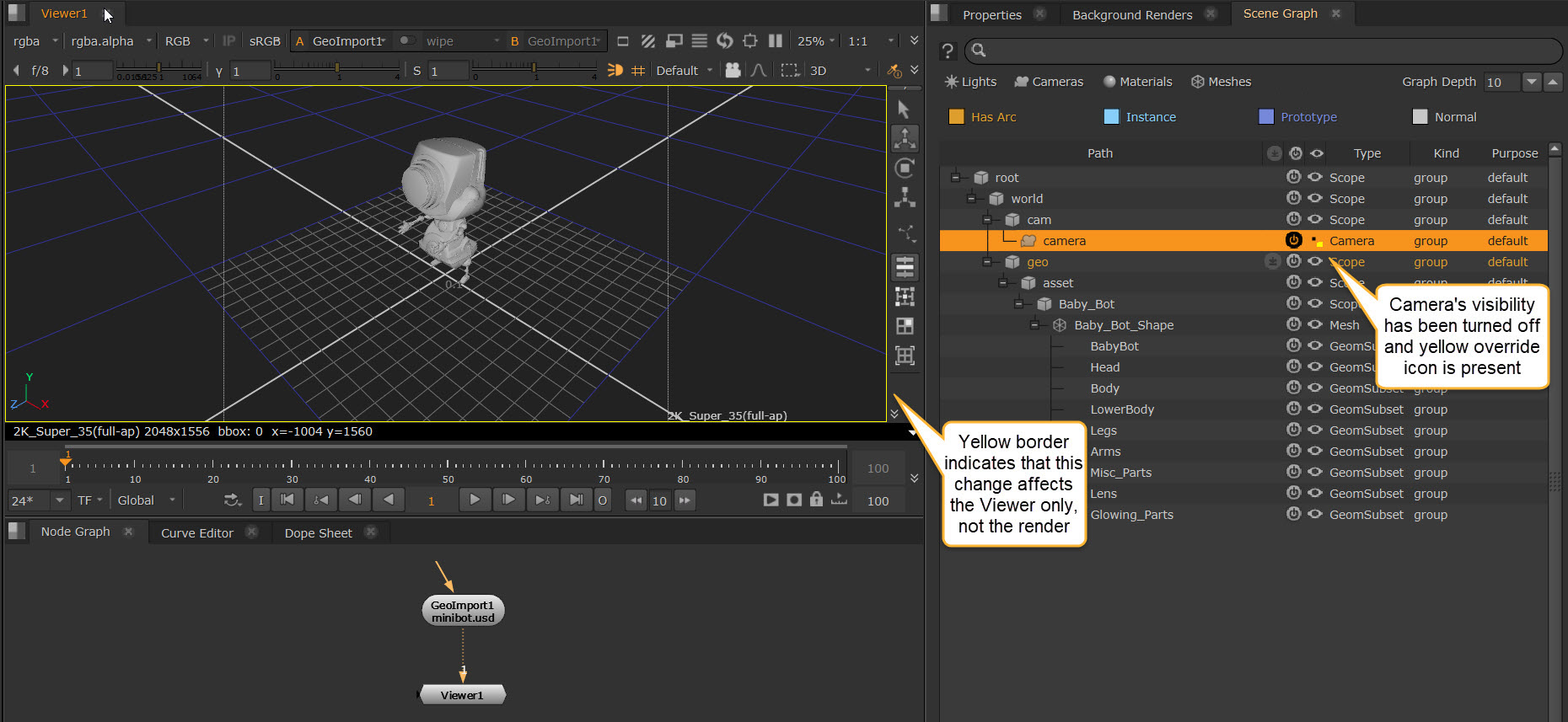 You can turn prims off (deactivate them) in the Scene Graph or simply not show them in the Viewer. Changing a prim’s Visibility or Active overrides in the Scene Graph will only affect those states for the Viewer, not for any upstream nodes, e.g. Scanline Render nodes or Write nodes.