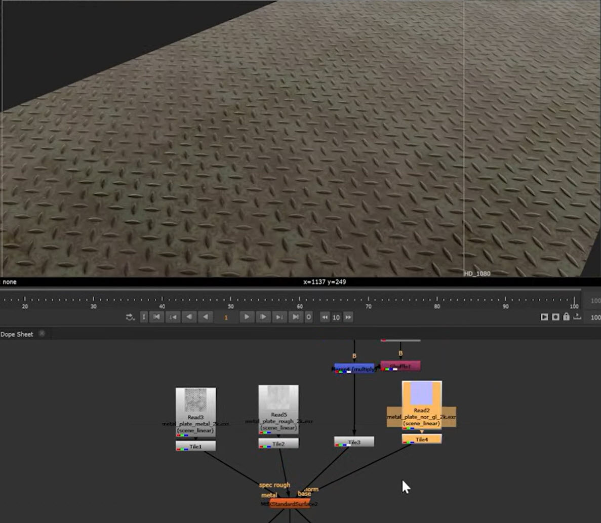 In this example, we will use MtlXStandardSurface to add base, normal, specular roughness, and metalness texture maps to a metal floor sheet to give a realistic metallic look.