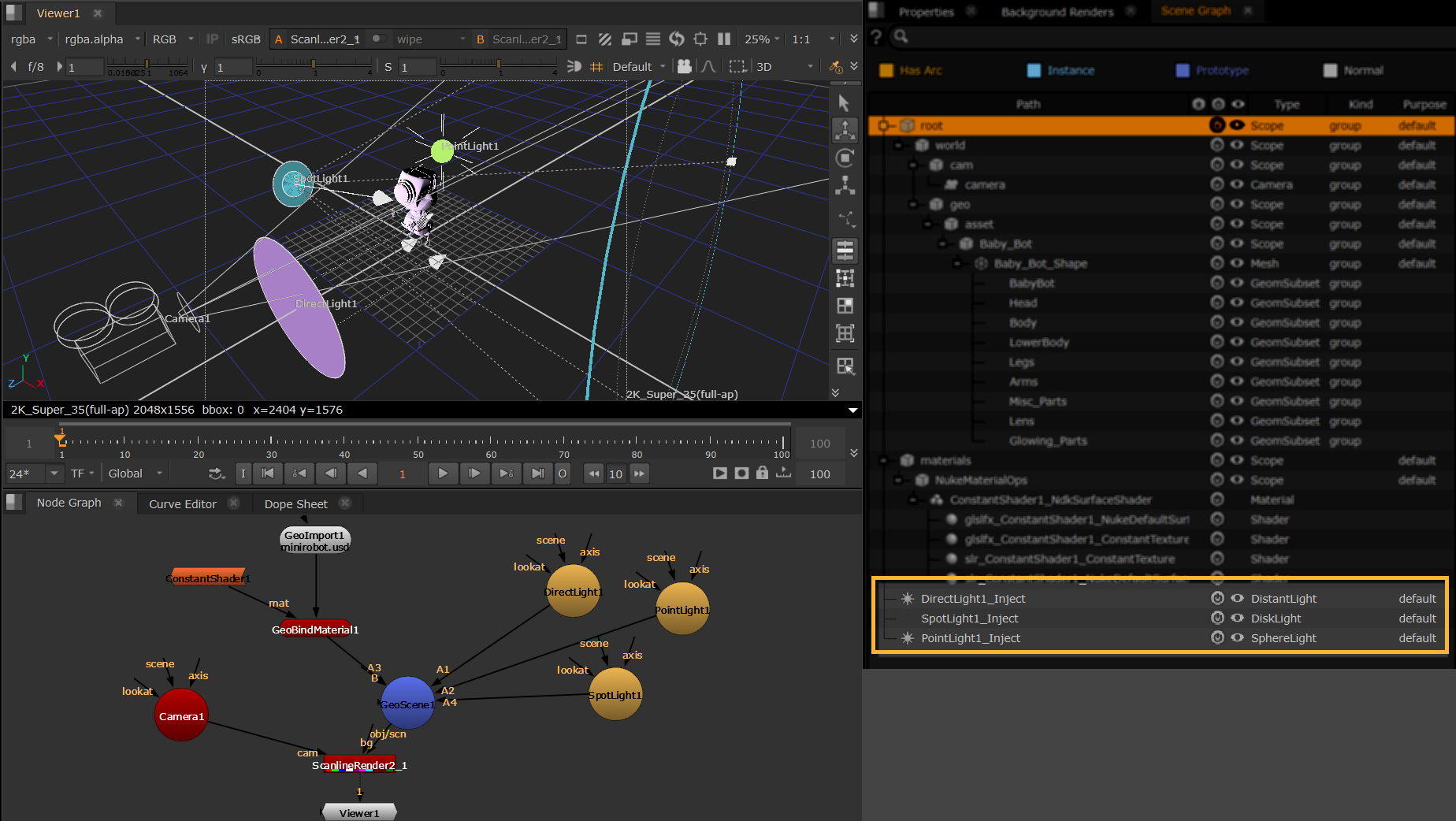 • To add a new light, add any of the light nodes to your node graph and connect it to the GeoScene node that is downstream of your geometry.
