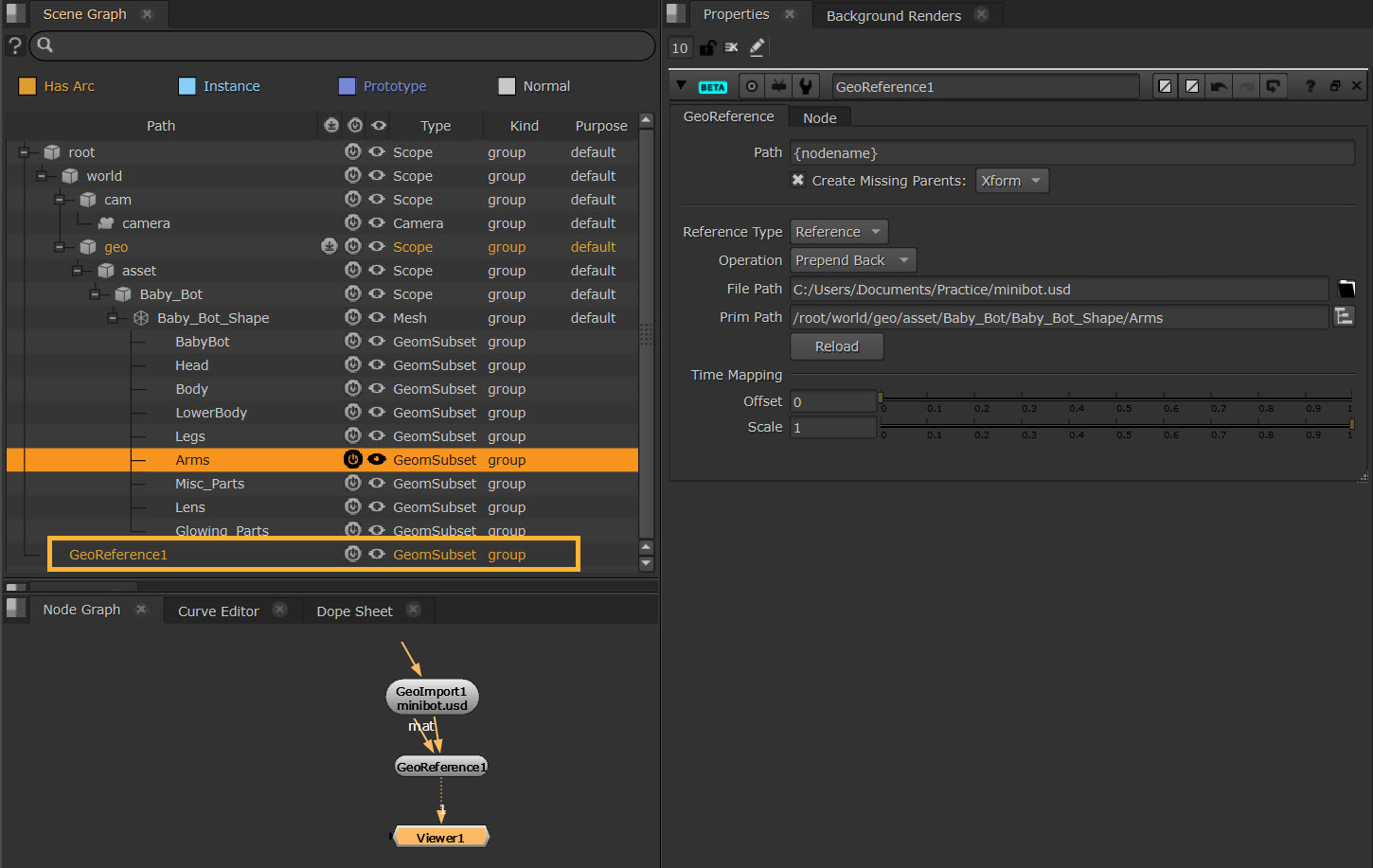 The new reference object is added to the bottom of the scene graph by default using the {nodename} variable in the Path control. In this case, {nodename} is GeoReference1. Create Missing Parents sets the type of prim to create if there are missing ancestors in the path.