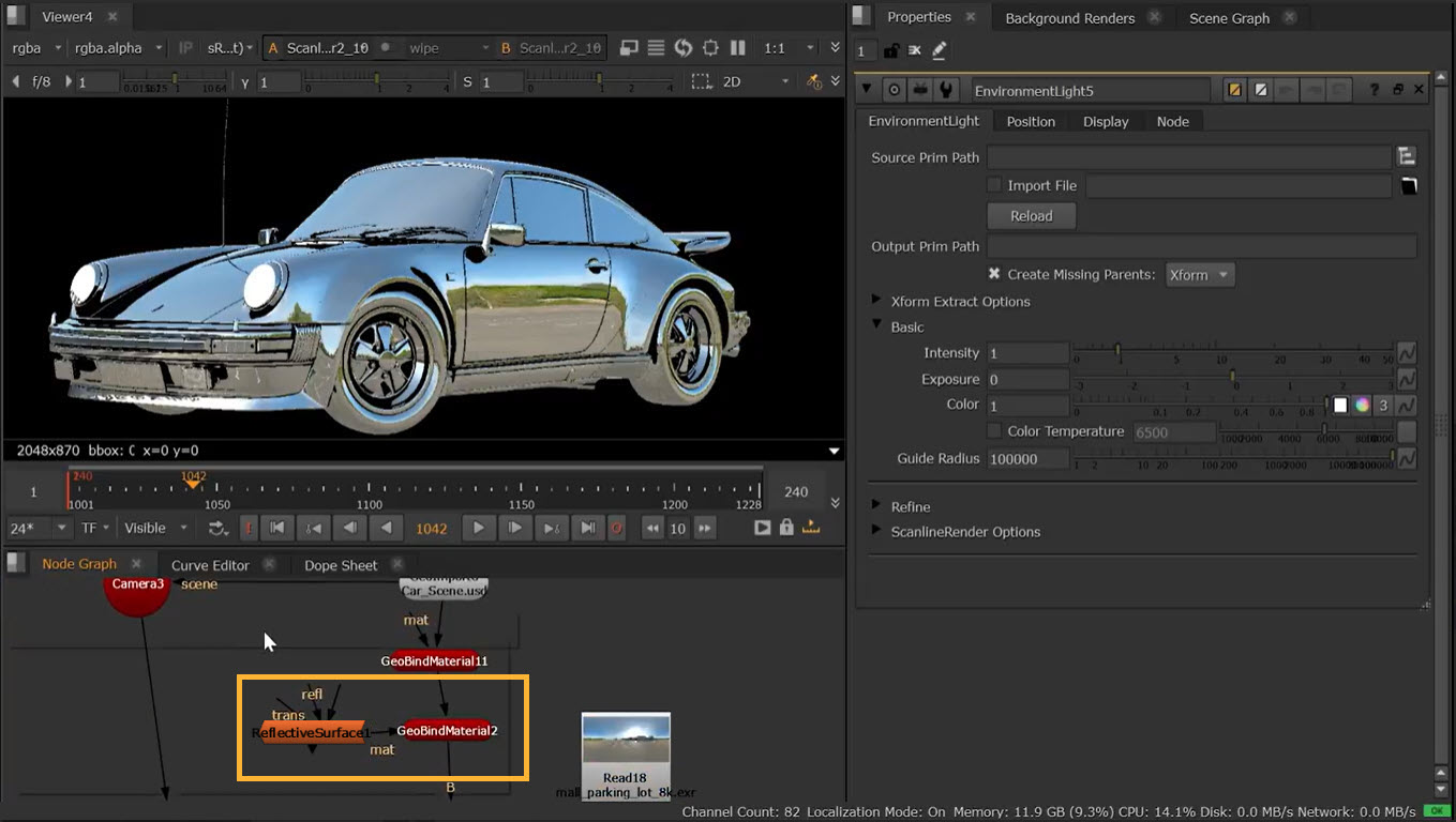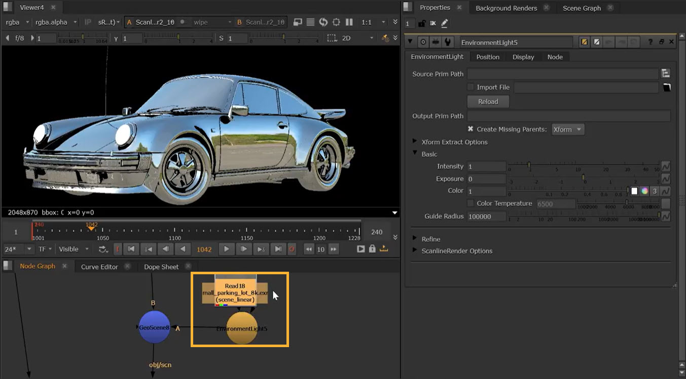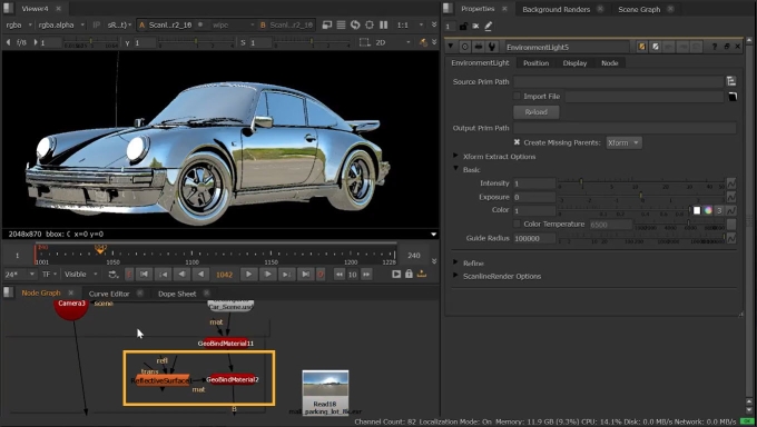 2.   Add a GeoScene node and connect any lights that will be reflected in your scene. For example, you could add an EnvironmentLight to reflect an image map off your geometry. See Light Your Scene.