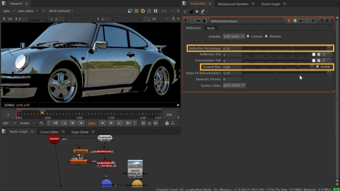 The Reflection Percentage knob lets you balance between reflection and transmission with 1 being a fully reflective surface and 0 being a transmissive surface. The Fresnel Bias sets the amount of reflectivity you see, typically based on the angle that you look at a surface.