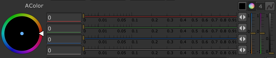 Parameters with four floating-point values, i.e. of type float4 or float[4], will be interpreted as colours with alpha, and will generate an AColor_knob. This initially shows a single entry box and slider, a button to split to four entry boxes, a button to pop up the Nuke color wheel, and a swatch showing the current color plus an eyedropper for sampling.