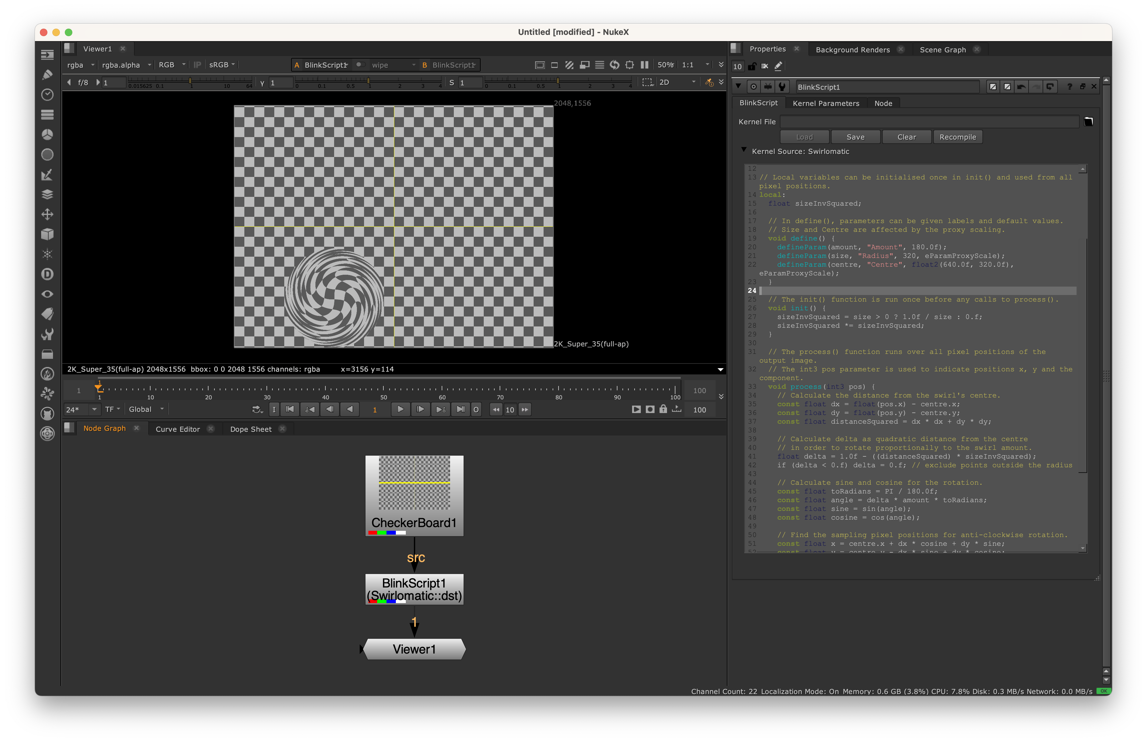Add a Viewer and connect this to the BlinkScript node’s output. You should see a swirl effect.