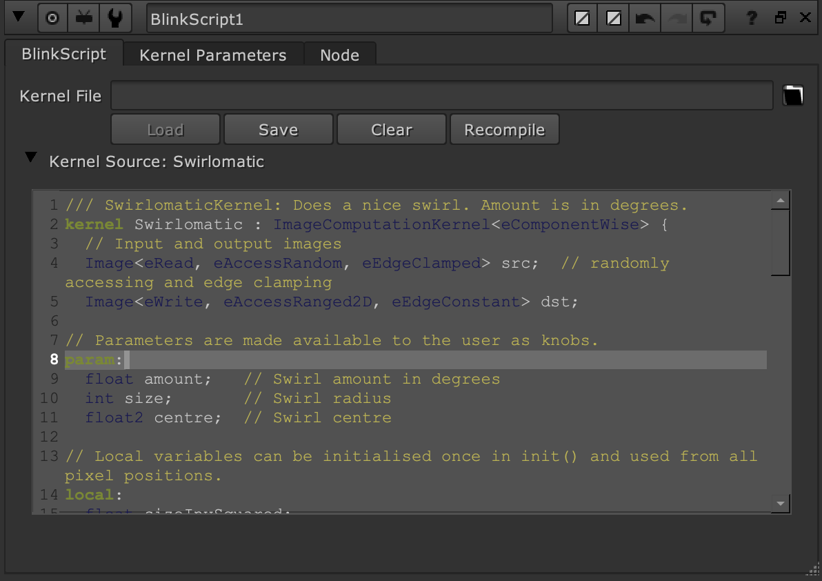 When a BlinkScript node is created, it will automatically load the Swirlomatic example kernel, which takes a single input.