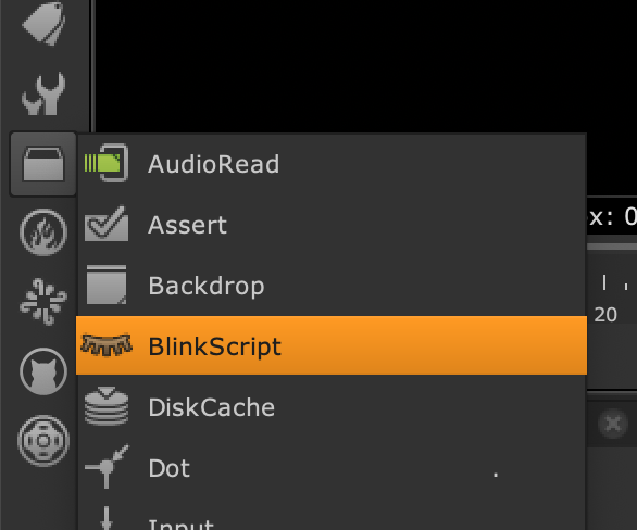 Create a BlinkScript node from the Other menu. Alternatively, you can press the Tab key in the node graph and enter