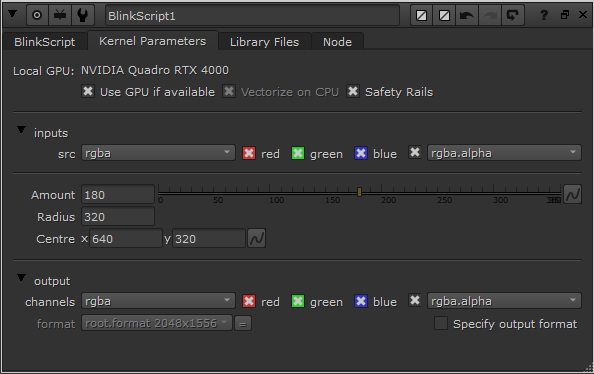 If your kernel contains parameters that can be controlled by the user, these will be displayed here. When the node is first created, it has the three Swirlomatic parameters: Amount, Radius and Centre. For more information about the types of parameters that can be used, see Parameters and Knobs.