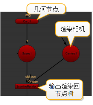 每个3D场景均包含以下对象:“场景”节点,“相机”节点,一个或多个几何节点(即,卡片,球体,obj)和一个ScanlineRender节点。3D场景的示例显示在总览和下图。在该示例中,“场景”节点从几何节点接收输出,并将这些对象的组合发送到ScanlineRender节点,在该节点上将输出转换回2D。