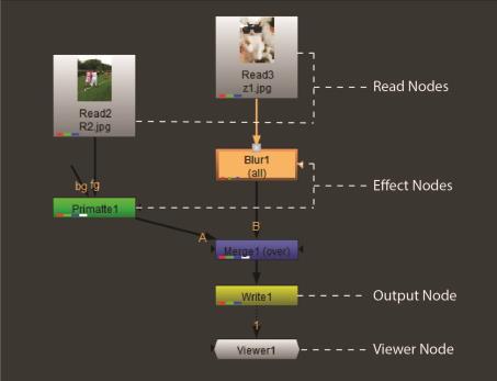 在上图中,您看到了一个非常简单的示例Nuke脚本。二读节点引用磁盘上的介质。效果节点提取遮罩并模糊图像。一种合并节点设置为结束,合成前景图像(输入A)在背景图片(输入B )。最后,一个写节点渲染完成的合成并将其输出到磁盘。还有一个观看者节点,它显示脚本中任何节点的输出。