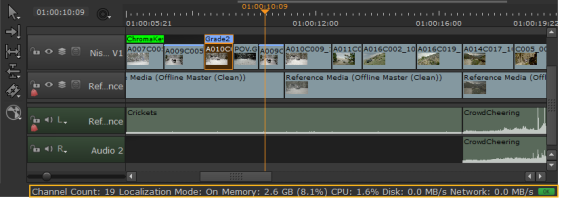 | 5. | 打开Nuke比较中Compositing环境在同一会话中,双击Nuke比较您也可以打开Nuke比较中Compositing环境在同一会话中,通过右键单击Nuke在时间轴上方或在项目箱中比较并选择Open In > Node Graph。 |