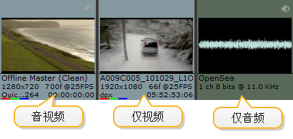 该界面将您的剪辑分为三大类:“音频和视频”,“仅音频”和“仅视频”。剪辑的显示方式会有所不同,具体取决于剪辑的内容,位置以及在查看器中的当前模式。
