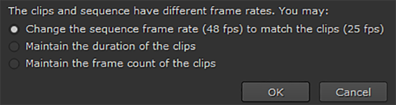 但是,如果时间线已经填充,并且您要添加的剪辑与时间线的帧速率不同,则会提示您选择是否保留剪辑的持续时间或帧数。