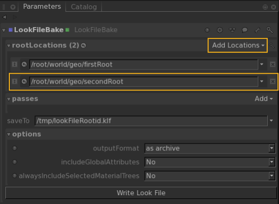 • 编辑LookFileBake节点,选择Add Locations > Path,在节点的Parameters 标签,然后输入要添加到结果中的场景图位置的路径rootLocations领域。对要添加的每个其他根位置重复上述步骤。