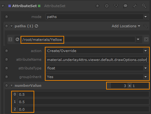 | 10. | 添加一个AttributeSet节点,并将其连接到图的底部。Middle-mouse+drag 的Yellow从场景图到CEL路径字段的材质,并设置以下参数: |