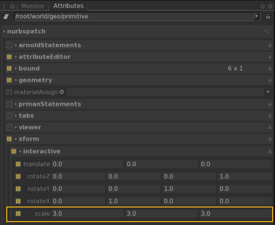 | 3. | 在xform.interactive下,每个X,Y,Z轴的比例都设置为3.0。返回到“节点图”中的PrimitiveCreate节点,并输入Z比例值5.0。 |