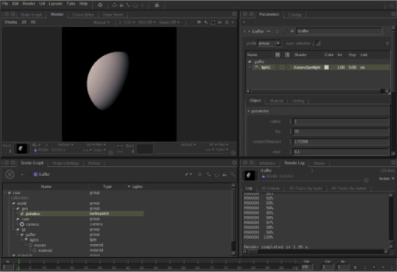 要对本教程中创建的场景执行预览渲染,请右键单击GafferThree节点,然后选择Preview Renders。在GafferThree节点上生成的场景将发送到渲染器。这将使用您的生产渲染器,而不是内部的Katana渲染器(Katana没有自己的内部渲染器)。