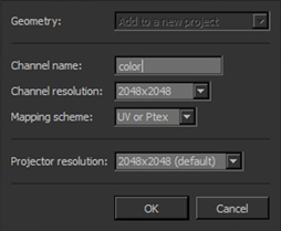 | 4. | 和以前一样,如果没有打开任何项目Mari,脚本将创建一个新项目,并提示您为投影指定一个通道。系统提示您输入Channel name,将Mapping scheme , 提供一个Channel resolution 最后,选择Projectorresolution用于新频道。 |