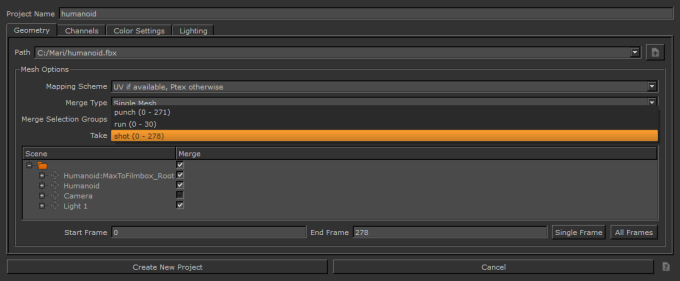 FBX以类似于Alembic的方式将动画存储在几何体上,并支持动画具有骨骼的概念,这使您可以在网格上使用相同的骨骼结构来创建不同的动画。每个拍摄都与同一个对象相关,并且可以具有不同的动画范围。在Mari,此数据显示在New Project对话。您也可以从Take下的下拉菜单Mesh Options。但是,在Mari,动画片段的FBX概念仅适用于几何图形加载。
