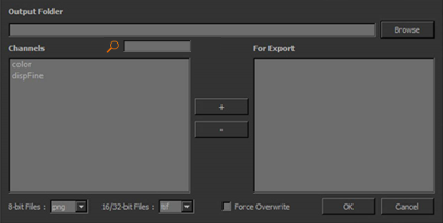 在对话框底部, 8-bit Files和16/32-bit Files下拉菜单列出了所有文件格式,您可以在其中导出通道以在Maya中使用。选择之前OK,请确保设置所需的文件格式。 |