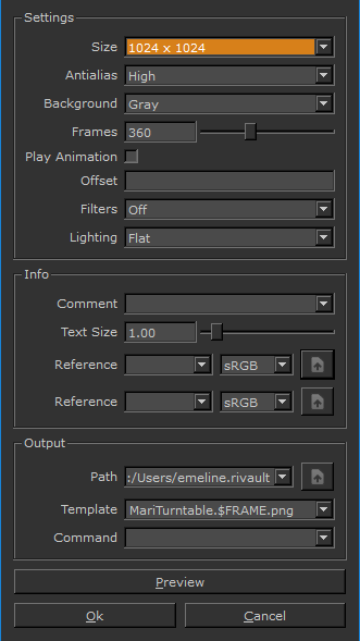 例如,偏移量为0,则第一张图像为MariTurntable_1.jpg。偏移量为360,第一个图像为MariTurntable_361.jpg。您可以使用它为一个轴生成一个框架序列,然后四处移动模型并为另一个轴制作另一组框架。