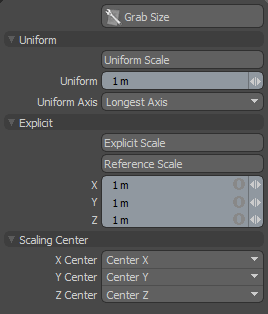 的Uniform Scale选项提供了一种在单个步骤中均匀缩放选择的所有轴的方法。要使用,请先选择Grab Size命令。这将捕获最长的轴长并将其插入到Uniform值输入字段作为参考点。接下来,如果您希望缩放中心不是默认边界框中心,则选择它。在输入新的显式值Uniform输入字段。在Uniform Axis,定义要绝对缩放的轴,然后最后单击Uniform Scale按钮执行缩放操作。