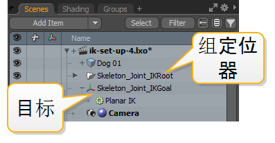 将IK修改器应用于链会创建一个目标项目,并添加一个组定位器作为IK链的整体父级。